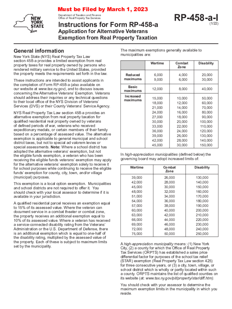 Must be Filed by March 1, 2023RP458aIDepartment of Taxation and Finance Office of Real Property Tax ServicesInstructions for Form RP458a(1/22)Application for Alternative Veterans Exemption from Real