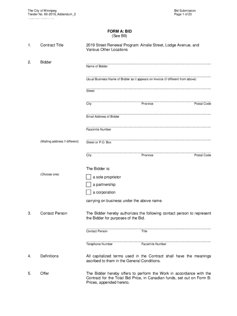 The City of Winnipeg Tender No. 602019_Addendum_2Bid Submission Page 1 of 23Template Version: C420190115 REFORM A: BID (See B9) 1. Contract Title2019 Street Renewal Program: Aisle Street, Lodge Avenue,