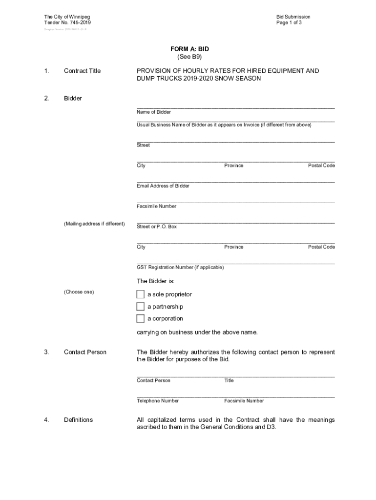 The City of Winnipeg Tender No. 7452019Bid Submission Page 1 of 3Template Version: S320190115 S LRF ORM A: BID (See B9) 1. Contract Title2. BidderPROVISION OF HOURLY RATES FOR HIRED EQUIPMENT AND