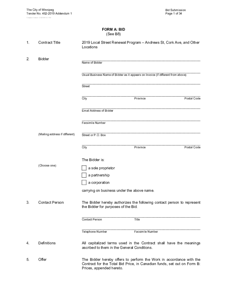 The City of Winnipeg Tender No. 4522019 Addendum 1Bid Submission Page 1 of 34Template Version: C420190115 REFORM A: BID (See B8) 1. Contract Title2019 Local Street Renewal Program Andrews St, Cork