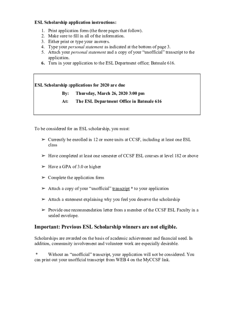 ESL Scholarship application instructions: 1. Print application form (the three pages that follow). 2. Make sure to fill in all the information. 3. Either print or type your answers. 4. Type your personal