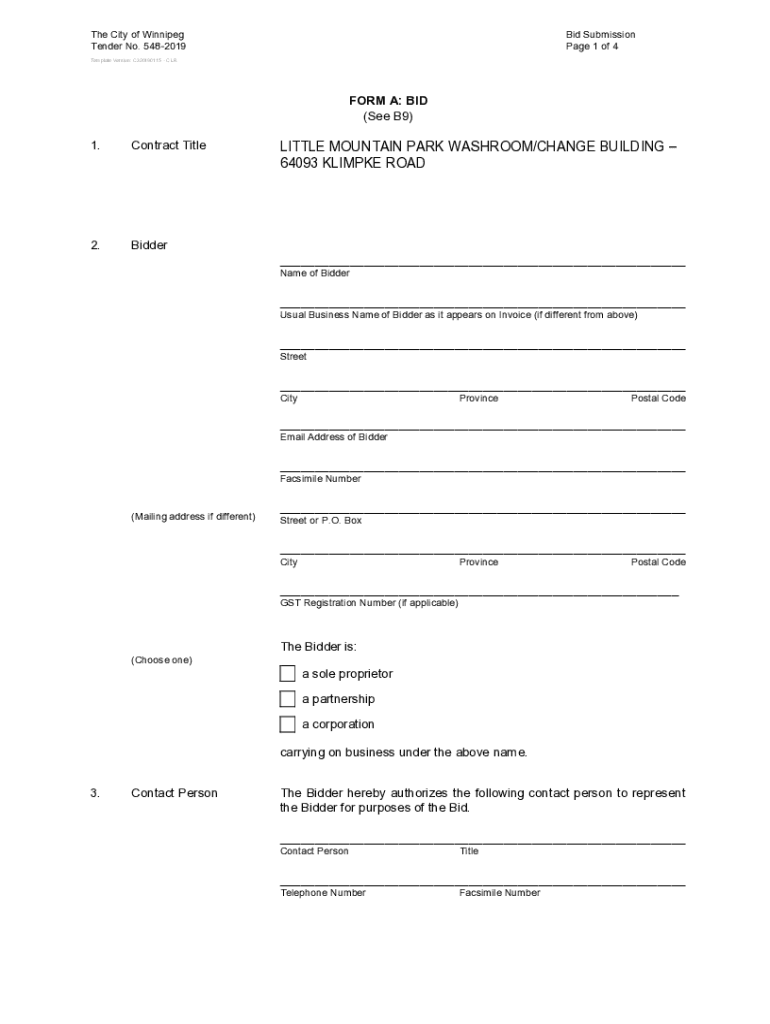The City of Winnipeg Tender No. 5482019Bid Submission Page 1 of 4Template Version: C320190115 C LRF ORM A: BID (See B9) 1. Contract Title2. BidderLITTLE MOUNTAIN PARK WASHROOM/CHANGE BUILDING 64093