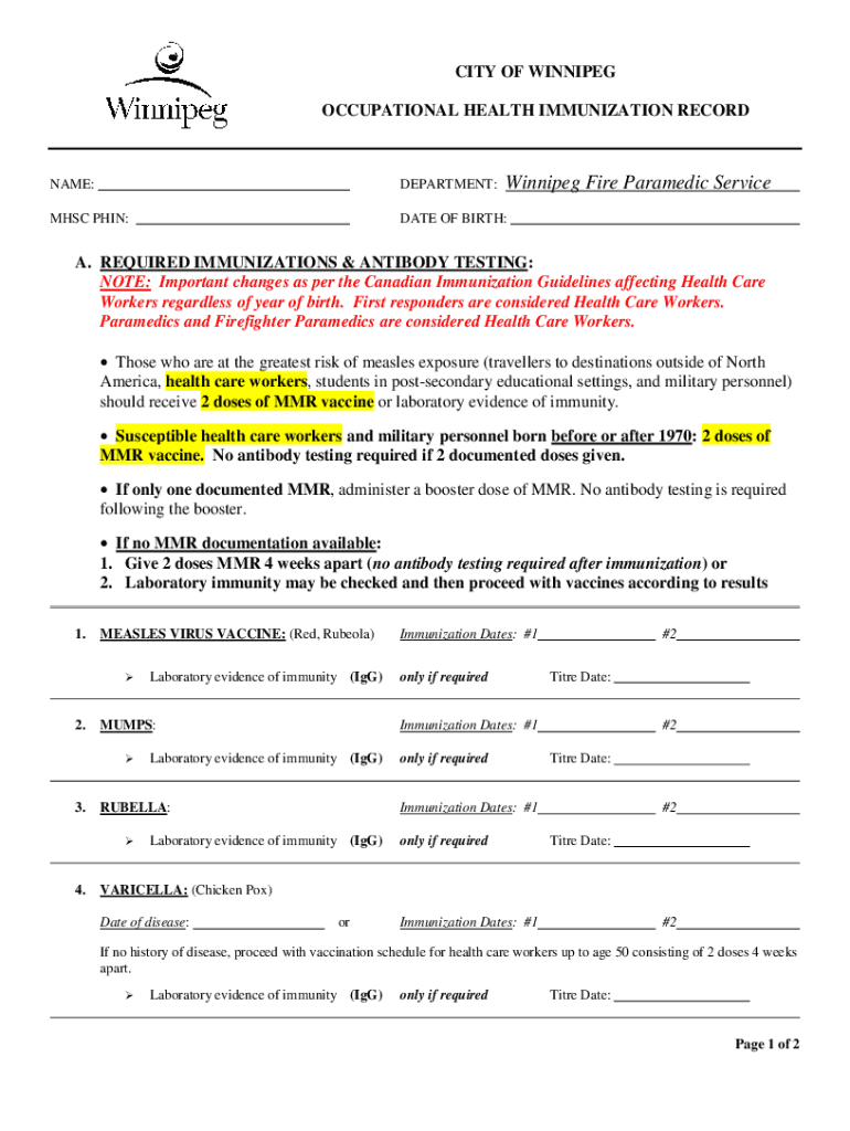 CITY OF WINNIPEG OCCUPATIONAL HEALTH IMMUNIZATION RECORD Winnipeg Fire Paramedic Servicemen:DEPARTMENT:MHSC PAIN:DATE OF BIRTH:A. REQUIRED IMMUNIZATIONS & ANTIBODY TESTING: NOTE: Important changes