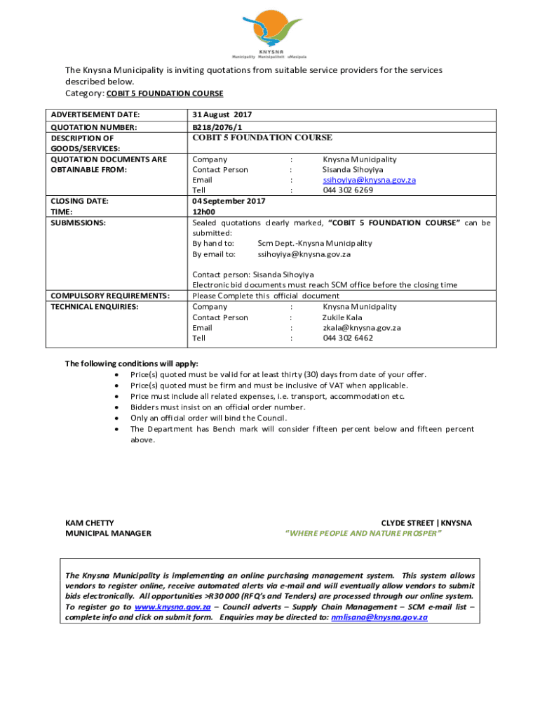 The Kṛṣṇa Municipality is inviting quotations from suitable service providers for the services described below. Category: CUBIT 5 FOUNDATION COURSE ADVERTISEMENT DATE: QUOTATION NUMBER: DESCRIPTION