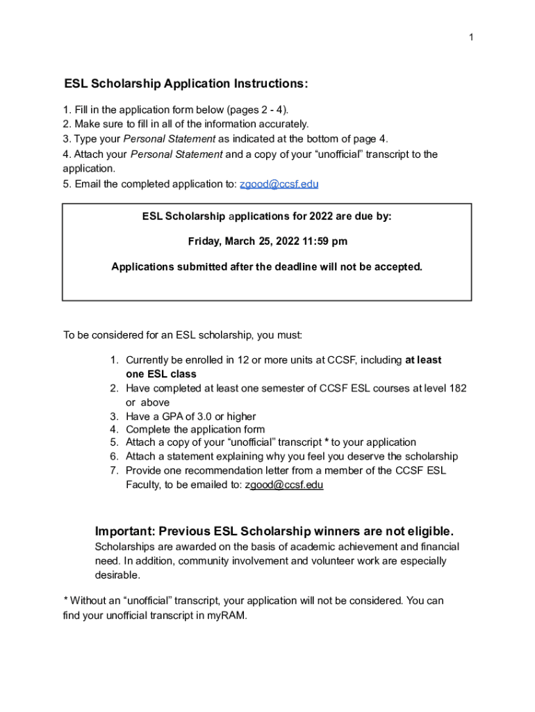 1ESL Scholarship Application Instructions: 1. Fill in the application form below (pages 2 4). 2. Make sure to fill in all the information accurately. 3. Type your Personal Statement as indicated at