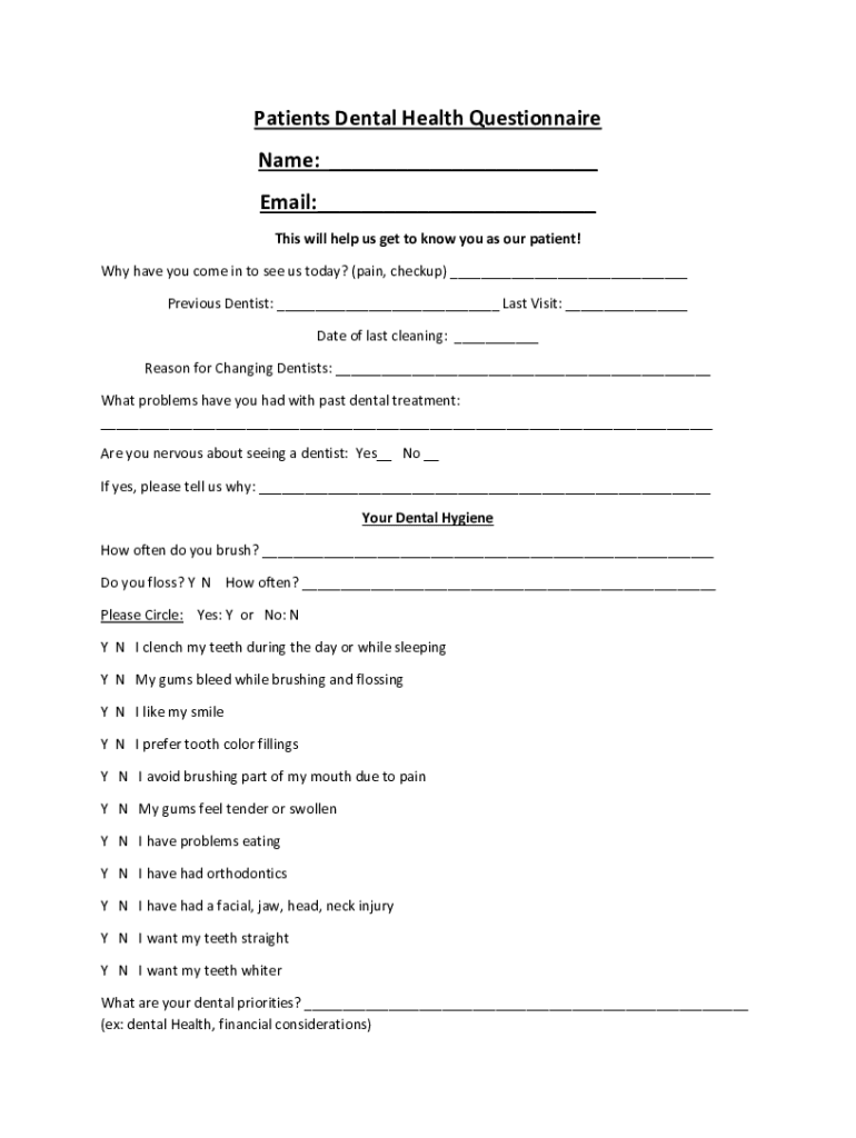 Patients Dental Health Questionnaire Name: ___ Email:___ This will help us get to know you as our patient! Why have you come in to see us today? (pain, checkup) ___ Previous Dentist: ___ Last Visit: