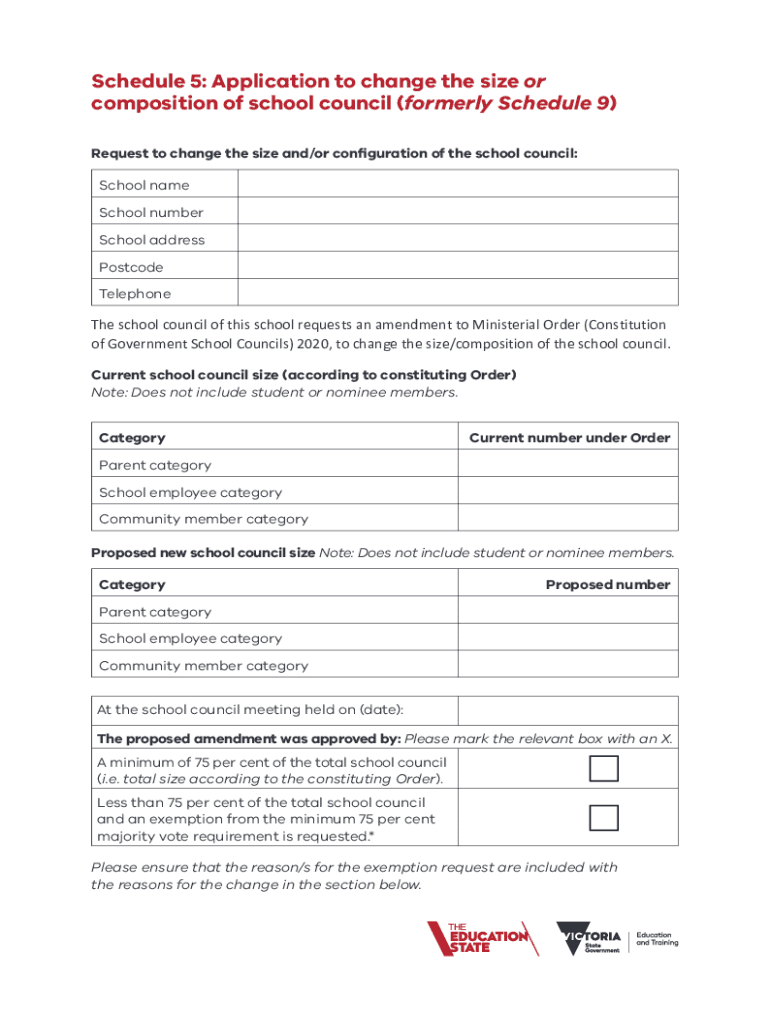 Schedule 5: Application to change the size or composition of school council (formerly Schedule 9) Request to change the size and/or configuration of the school council: School name School number School