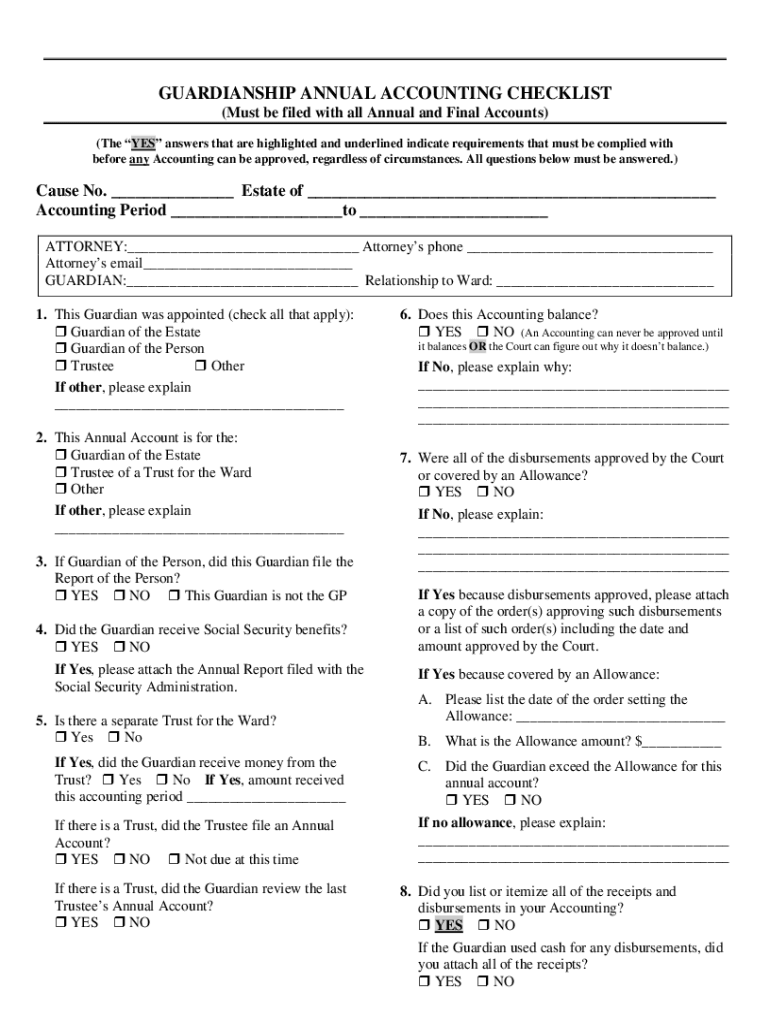 GUARDIANSHIP ANNUAL ACCOUNTING CHECKLIST (Must be filed with all Annual and Final Accounts) (The YES answers that are highlighted and underlined indicate requirements that must be complied with before
