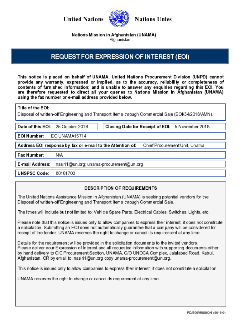 United NationsNations Infestations Mission in Afghanistan (UNIMA) AfghanistanREQUEST FOR EXPRESSION OF INTEREST (EOI) This notice is placed on behalf of UNIMA. United Nations Procurement Division