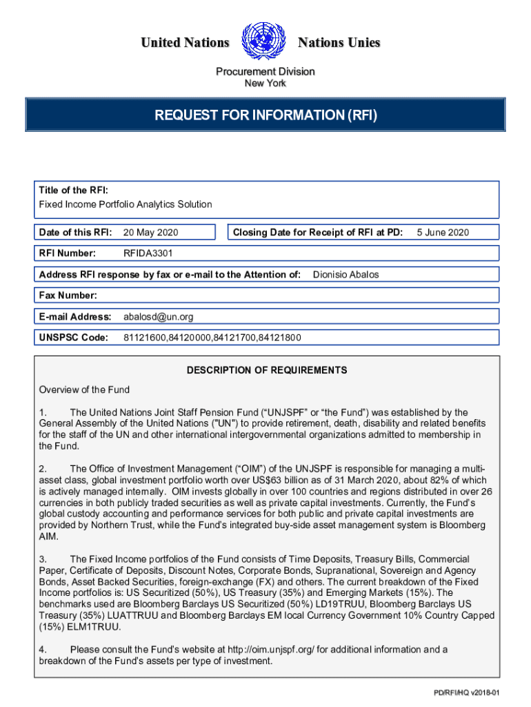 United NationsNations UniesProcurement Division New YorkREQUEST FOR INFORMATION (RFI)Title of the RFI: Fixed Income Portfolio Analytics Solution Date of this RFI:20 May 2020RFI Number:RFIDA3301Closing