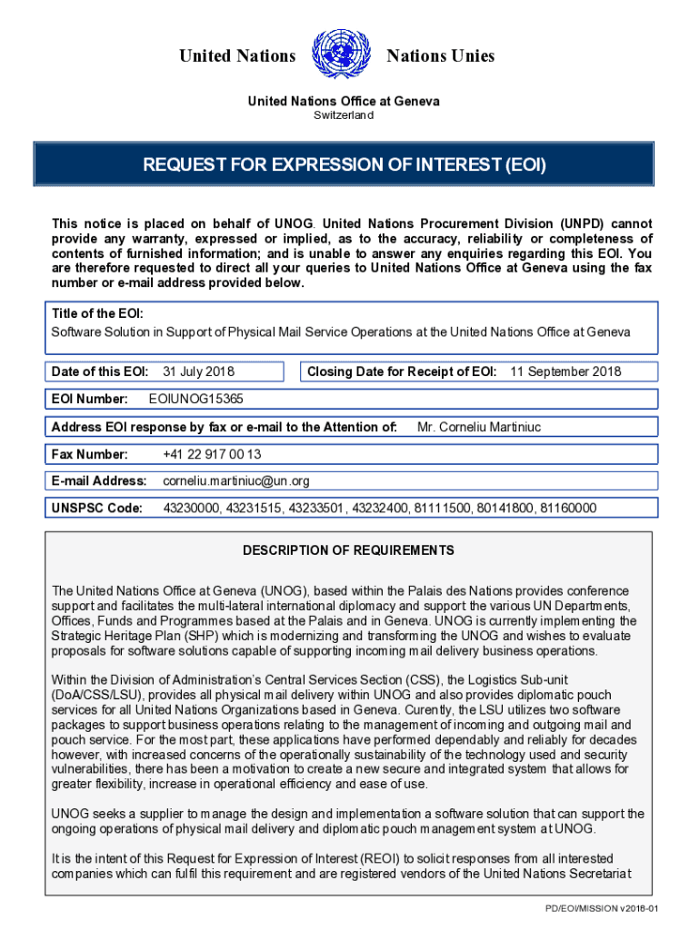 United NationsNations Unrequited Nations Office at Geneva SwitzerlandREQUEST FOR EXPRESSION OF INTEREST (EOI) This notice is placed on behalf of SNOG. United Nations Procurement Division (NPD) cannot