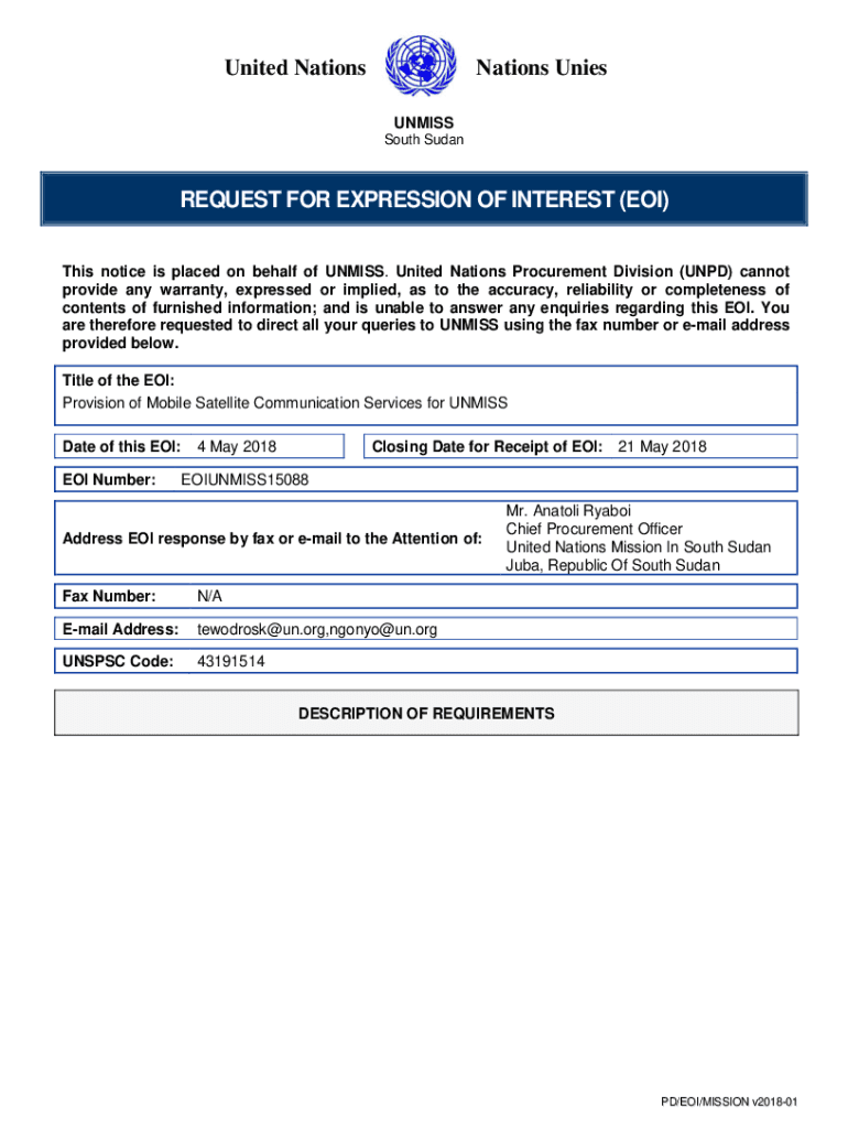 United NationsNations Units UNM ISS South SudanREQUEST FOR EXPRESSION OF INTEREST (EOI) This notice is placed on behalf of UNM ISS. United Nations Procurement Division (NPD) cannot provide any warranty,