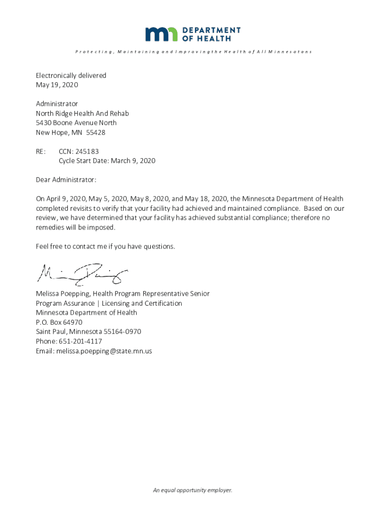 Protecting, MaintainingandImprovingtheHealthofAllMinnesotans Electronically delivered May19,2020 Administrator NorthRidgeHealthAndRehab 5430BooneAvenueNorth New Hope,MN55428 RE: CCN:245183 CycleStartDate:March9,2020DearAdministrator: