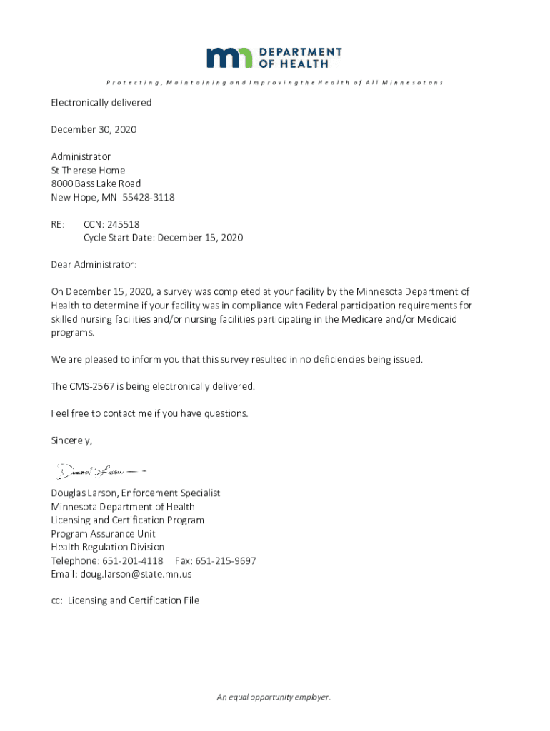 Protecting, MaintainingandImprovingtheHealthofAllMinnesotans Electronically delivered December30,2020 Administrator StThereseHome 8000BassLakeRoad New Hope,MN554283118 RE: CCN:245518 CycleStartDate:December15,2020DearAdministrator: