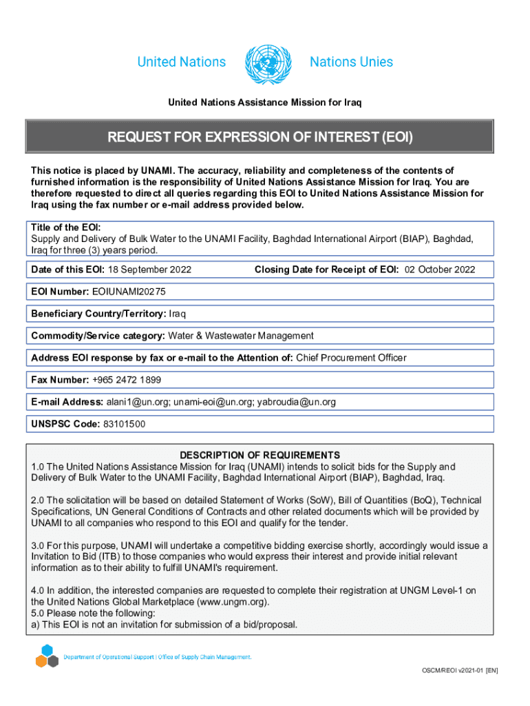 United Nations Assistance Mission for IraqREQUEST FOR EXPRESSION OF INTEREST (EOI) This notice is placed by INAMI. The accuracy, reliability and completeness of the contents of furnished information