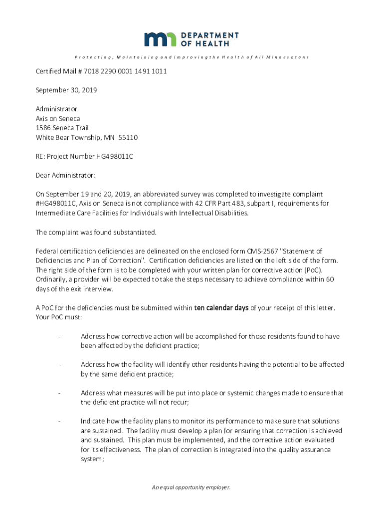 P r o t e c t i n g, M an i n t an i n i n g an n d I m p r o v i n g t h e H e an l t h o f A l l M i n n e s o t an n certified Mail # 7018 2290 0001 1491 1011 September 30, 2019, Administrator