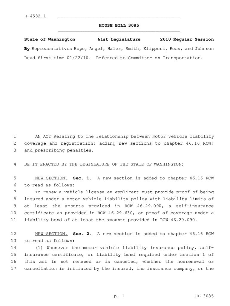 H4532.1___ HOUSE BILL 3085 ___State of Washington61st Legislature2010 Regular Session Representatives Hope, Angel, Haler, Smith, Clipper, Ross, and Johnson Read first time 01/22/10. Referred to Committee
