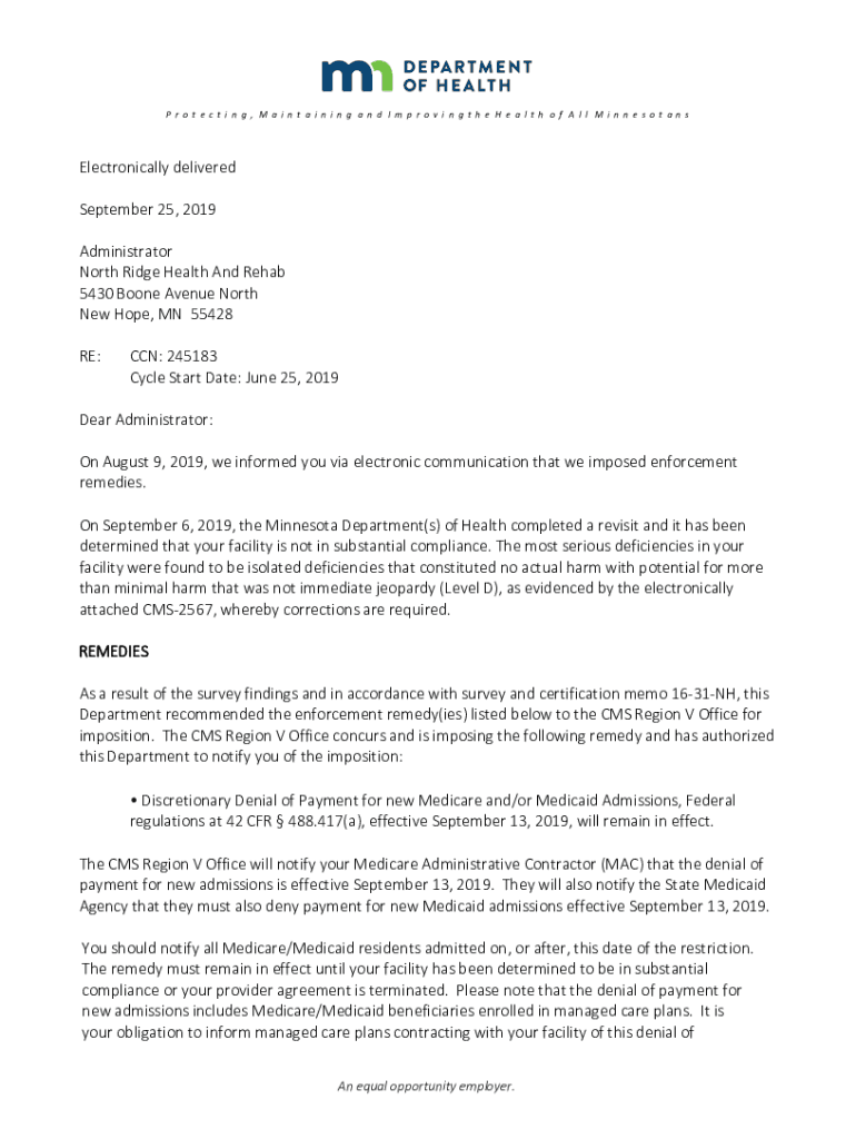 Protecting, MaintainingandImprovingtheHealthofAllMinnesotans Electronically delivered September25,2019 Administrator NorthRidgeHealthAndRehab 5430BooneAvenueNorth New Hope,MN55428 RE: CCN:245183 CycleStartDate:June25,2019
