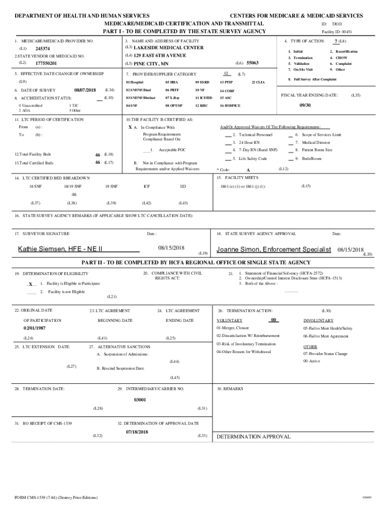 DEPARTMENT OF HEALTH AND HUMAN SERVICES CENTERS FOR MEDICARE & MEDICAID SERVICES MEDICARE/MEDICAID CERTIFICATION AND TRANSMITTAL ID: TOD Facility ID: 00451 PART I TO BE COMPLETED BY THE STATE SURVEY