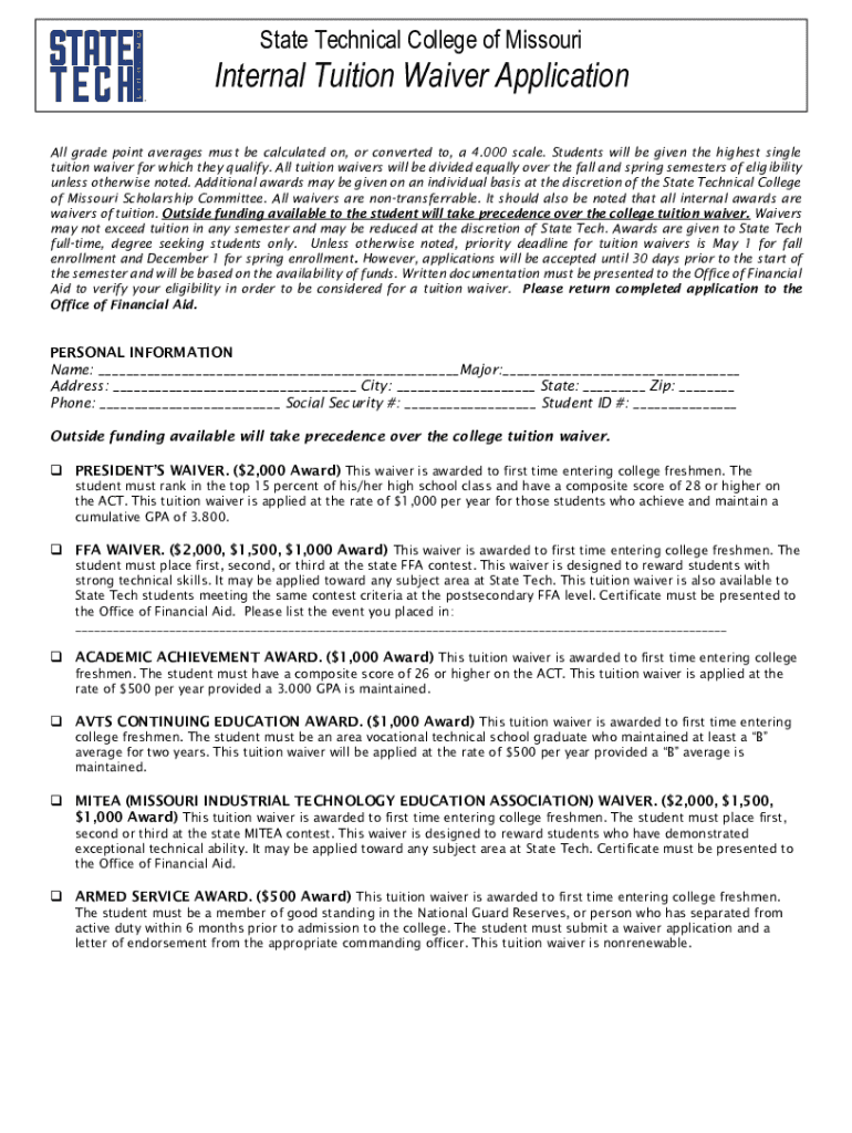 State Technical College of MissouriInternal Tuition Waiver Application All grade point averages must be calculated on, or converted to, a 4,000 scale. Students will be given the highest single tuition