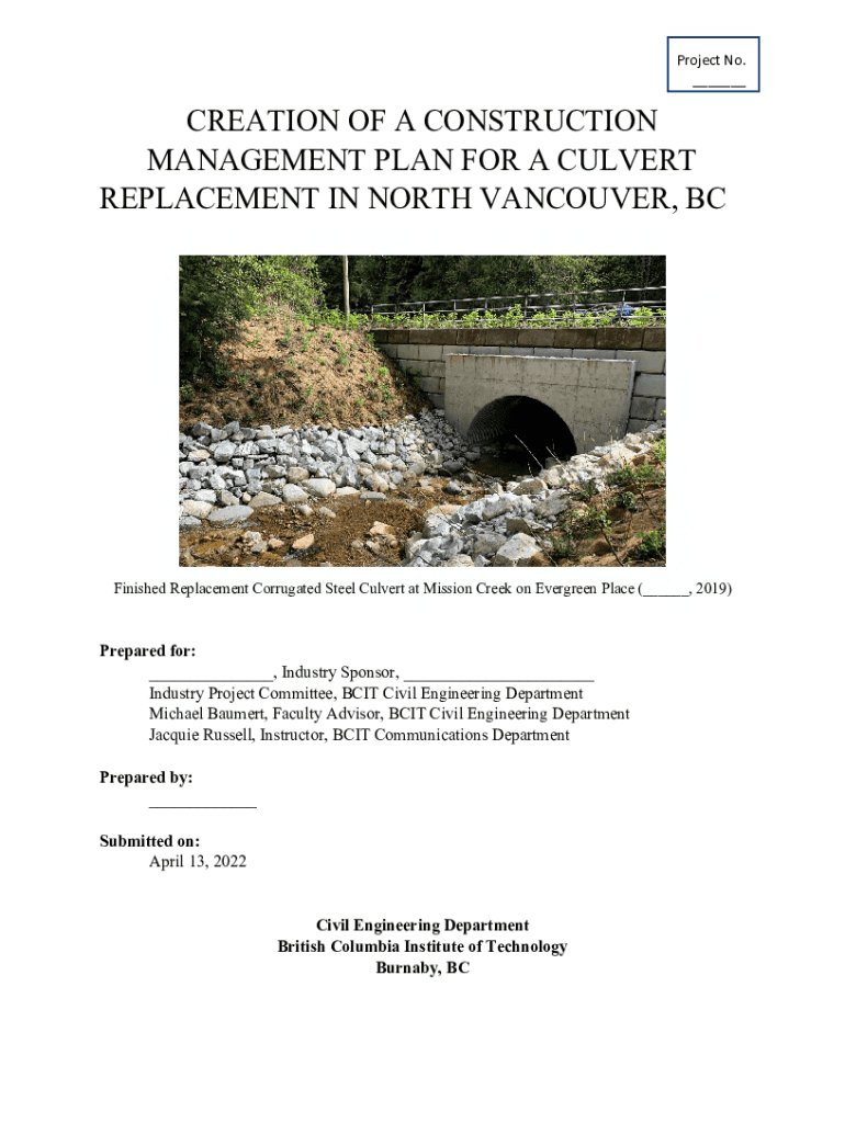 Project No. ___CREATION OF A CONSTRUCTION MANAGEMENT PLAN FOR A CULVERT REPLACEMENT IN NORTH VANCOUVER, Finished Replacement Corrugated Steel Culvert at Mission Creek on Evergreen Place (___, 2019)Prepared