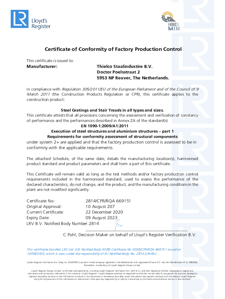 Certificate of Conformity of Factory Production Control This certificate is issued to:Manufacturer:Thiel Staalindustire B.V. Doctor Poelsstraat 2 5953 NP Never, The Netherlands. In compliance with