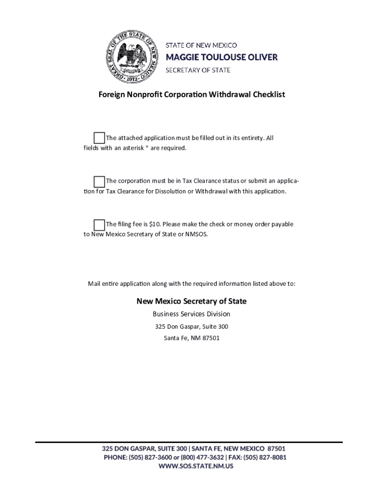 Foreign Nonprofit Corporation Withdrawal Checklist attached application must be filled out in its entirety. All fields with an asterisk * are required. The corporation must be in Tax Clearance status