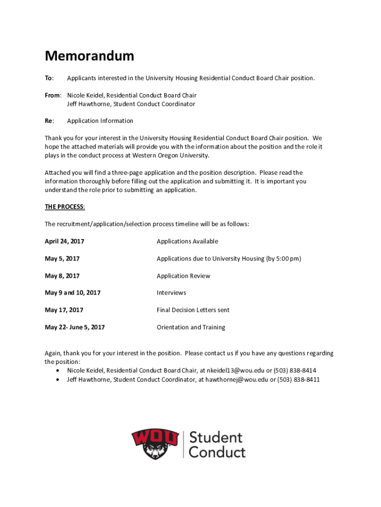 Memorandum To:Applicants interested in the University Housing Residential Conduct Board Chair position. From: Nicole Made, Residential Conduct Board Chair Jeff Hawthorne, Student Conduct Coordinator