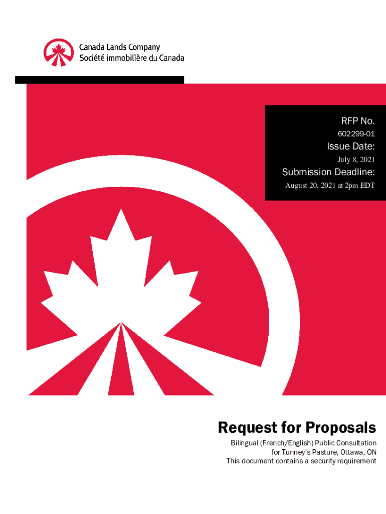 RFP No. 60229901Issue Date: July 8, 2021Submission Deadline: August 20, 2021, at 2pm Request for Proposals Bilingual (French/English) Public Consultation for Tunney's Pasture, Ottawa, ON This document