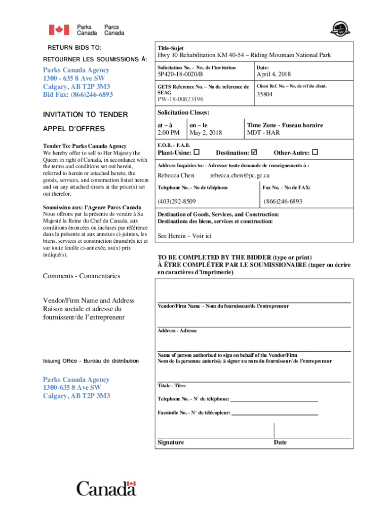 RETURN BIDS TO: RETURNER LES COMMISSIONS :Parks Canada Agency 1300 635 8 Ave SW Calgary, AB T2P 3M3 Bid Fax: (866)2466893INVITATION TO TENDERTitleSujetHwy 10 Rehabilitation KM 4054 Riding Mountain