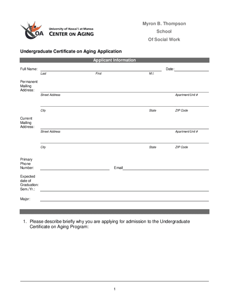 Myron B. Thompson School Of Social Work Undergraduate Certificate on Aging Application Applicant Information Full Name:Date: LastFirstM. I. Permanent Mailing Address: Street AddressApartment/Unit