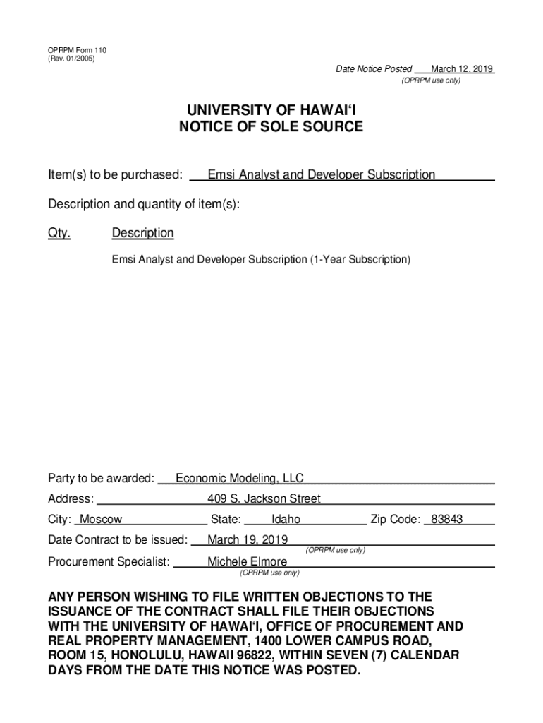 OP RPM Form 110 (Rev. 01/2005)Date Notice Posted March 12, 2019(OP RPM use only)UNIVERSITY OF HAWAII NOTICE OF SOLE SOURCE Item(s) to be purchased:MSI Analyst and Developer SubscriptionDescription