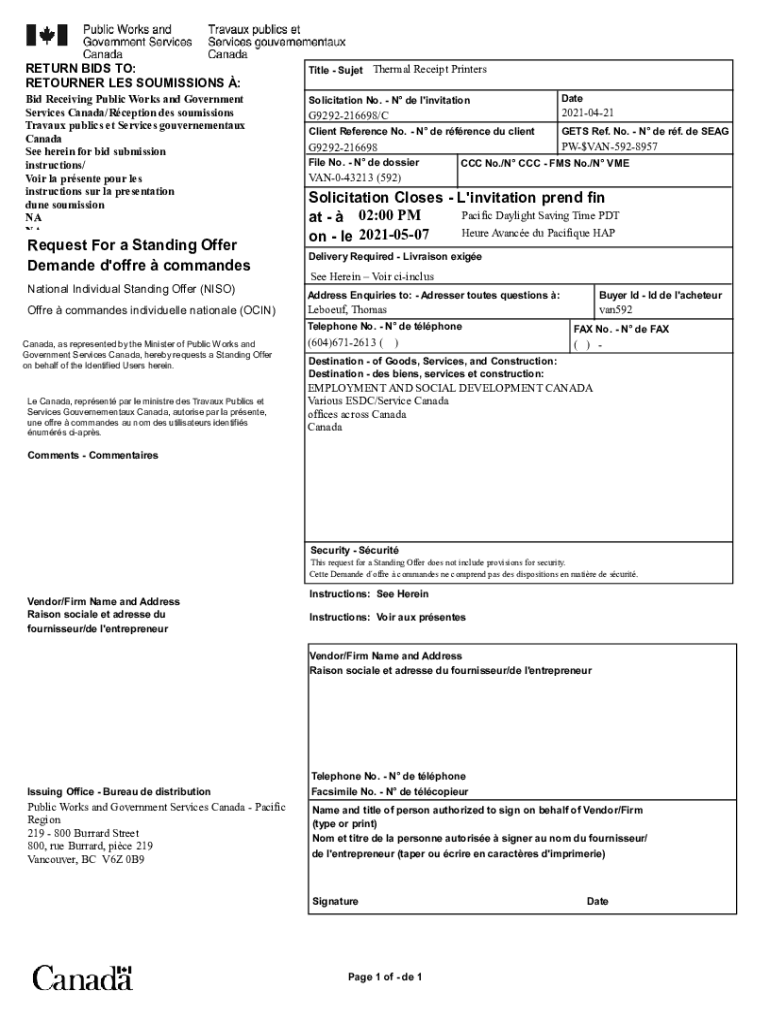 11RETURN BIDS TO: RETURNER LES COMMISSIONS :Title Suet Thermal Receipt Printers Receiving Public Works and Government Services Canada/Reception DES sou missions Travail public set Services gouvernementaux