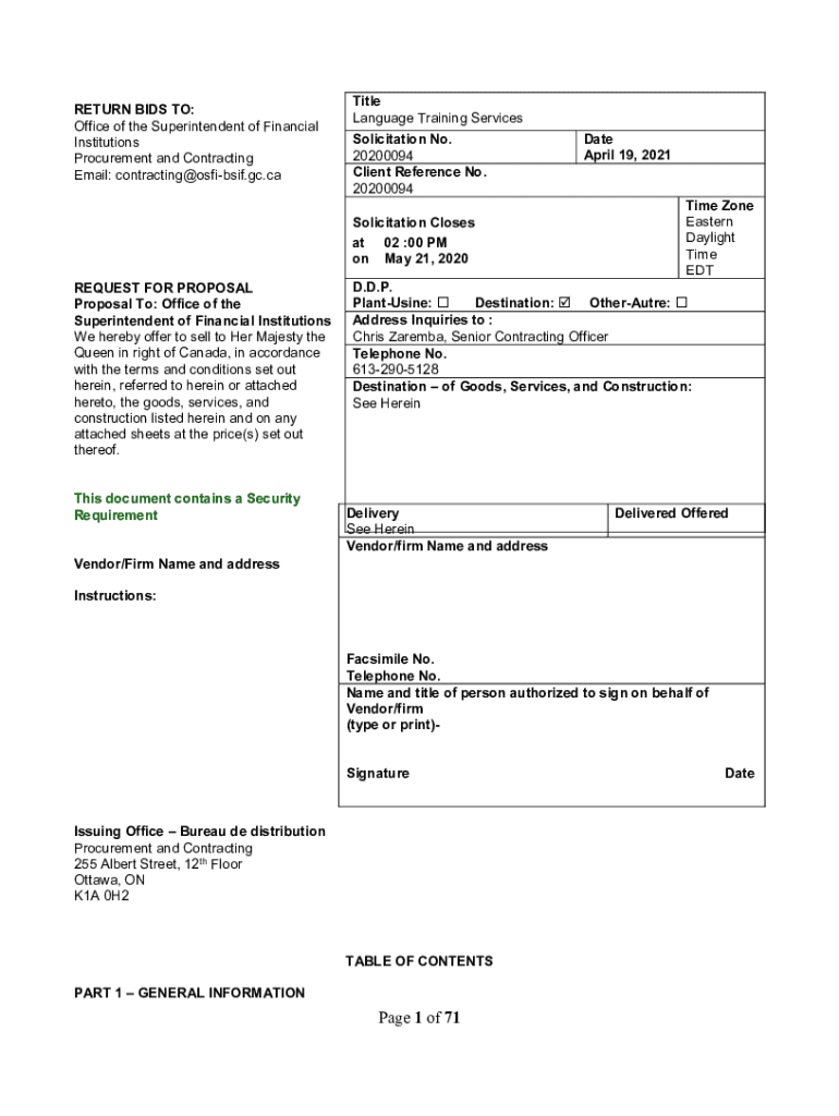 RETURN BIDS TO: Office of the Superintendent of Financial Institutions Procurement and Contracting Email: contracting@osfibsif.gc.caTitle Language Training Services Solicitation No. 20200094 Client