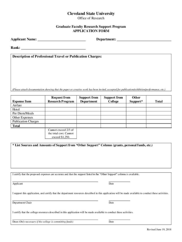 Cleveland State University Office of Research Graduate Faculty Research Support Program APPLICATION FORM Applicant Name:Department:Rank: Description of Professional Travel or Publication Charges:(Please