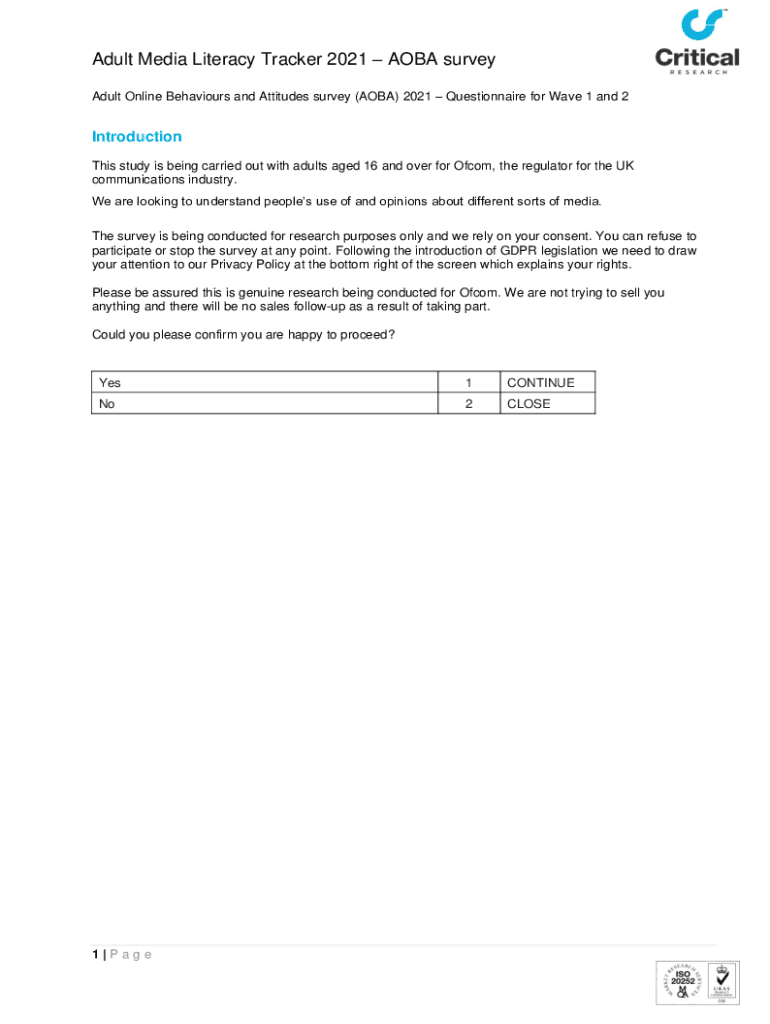 Adult Media Literacy Tracker 2021 ALBA survey Adult Online Behaviors and Attitudes survey (ALBA) 2021 Questionnaire for Wave 1 and 2Introduction This study is being carried out with adults aged 16