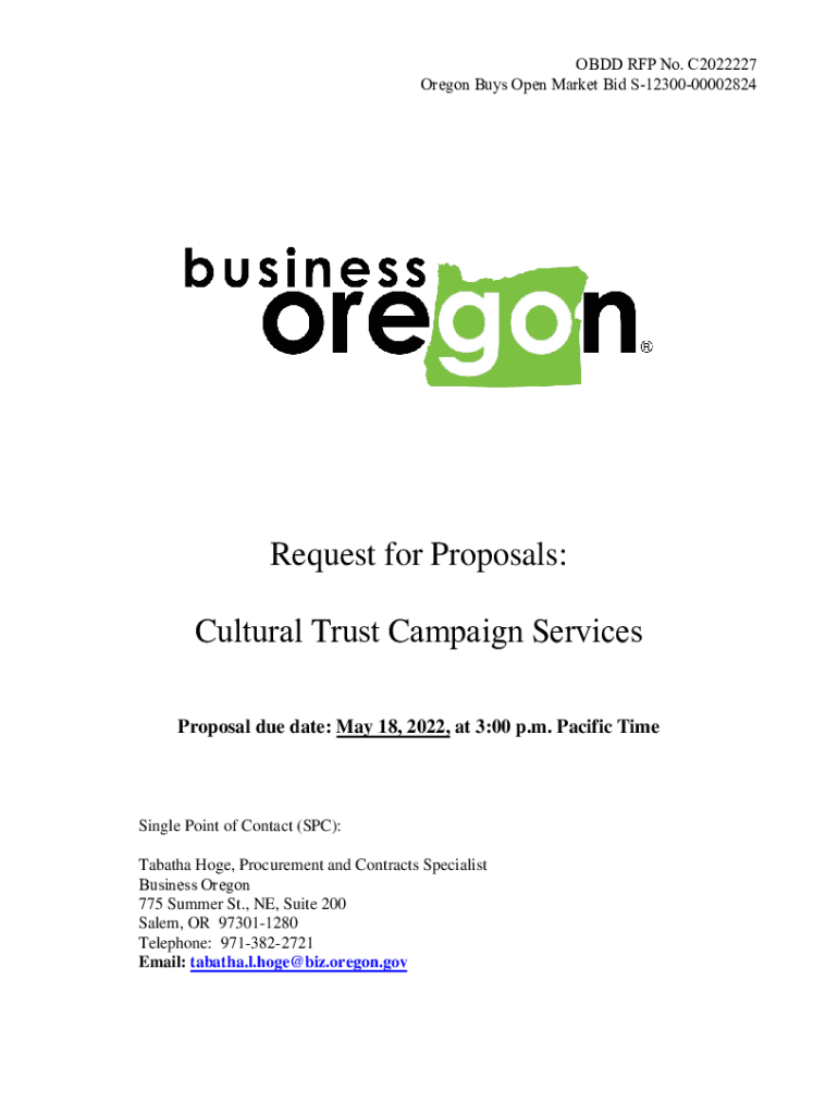 ODD RFP No. C2022227 Oregon Buys Open Market Bid S1230000002824Request for Proposals: Cultural Trust Campaign Services Proposal due date: May 18, 2022, at 3:00 p.m. Pacific Timeline Point of Contact