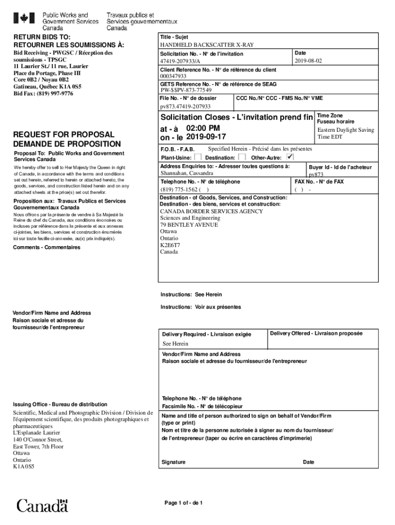 1 1RETURN BIDS TO: RETURNER LES COMMISSIONS :Title Outbid Receiving PW GSC / Reception DES sou missions TP SGC 11 Laurie St./ 11 rue, Laurie Place du Portage, Phase III Core 0B2 / Royal 0B2 Gatineau,