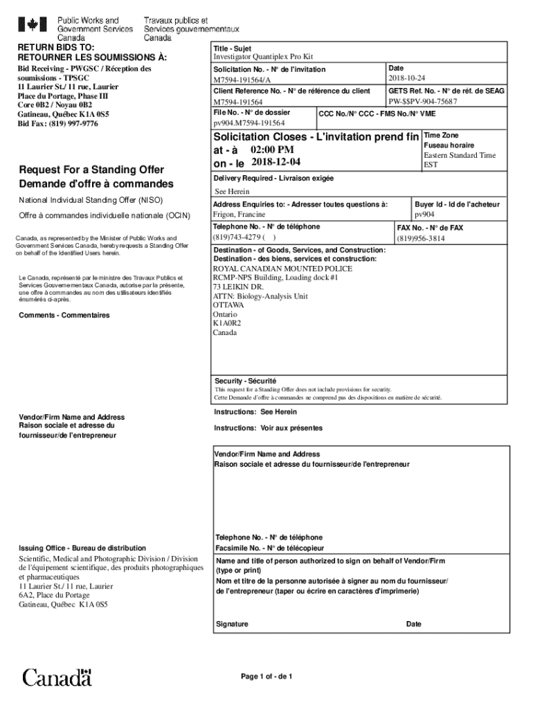 11RETURN BIDS TO: RETURNER LES COMMISSIONS :Title Outbid Receiving PW GSC / Reception DES sou missions TP SGC 11 Laurie St./ 11 rue, Laurie Place du Portage, Phase III Core 0B2 / Royal 0B2 Gatineau,