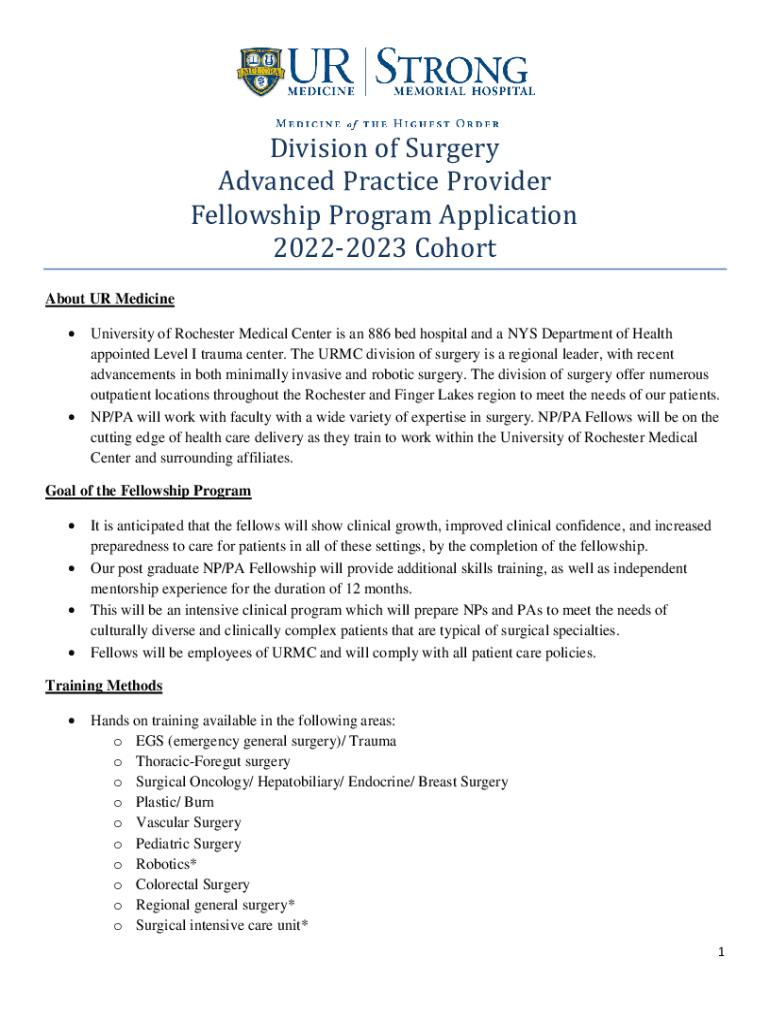 Division of Surgery Advanced Practice Provider Fellowship Program Application 20222023 Cohort About UR Medicine University of Rochester Medical Center is an 886 bed hospital and a NYS Department of
