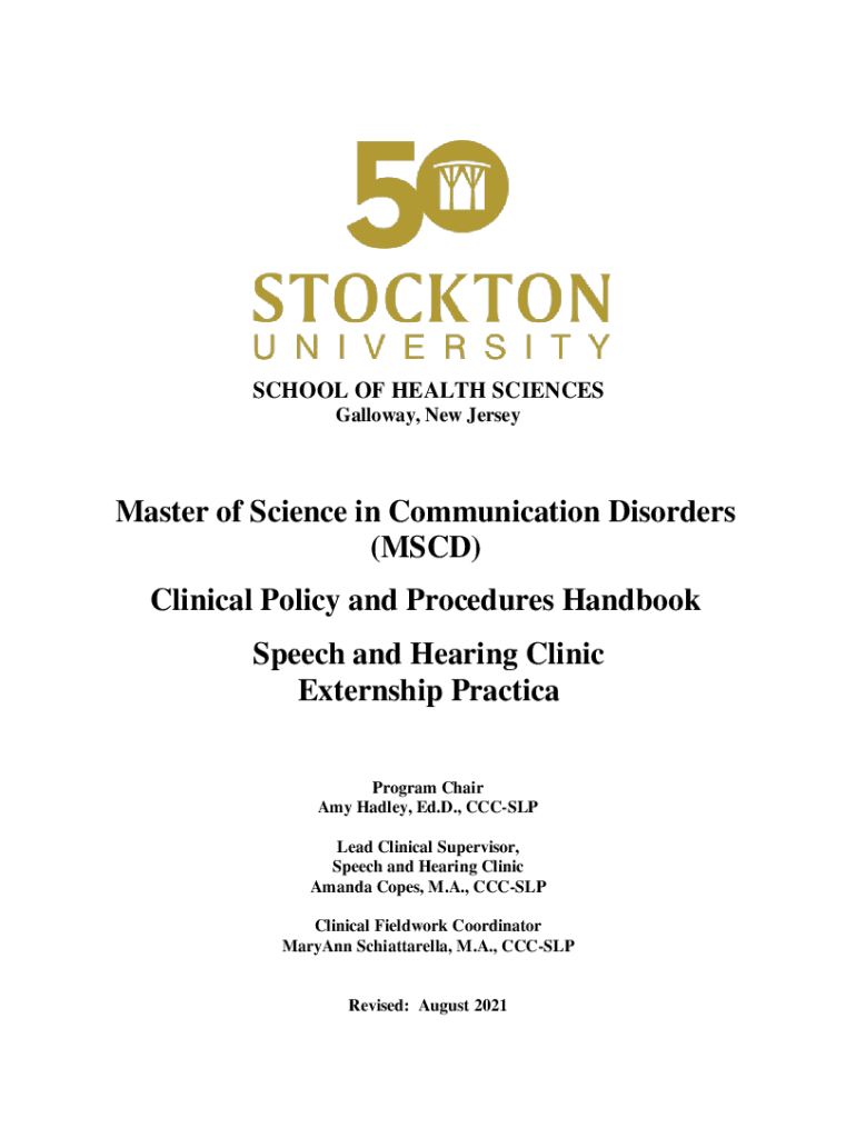 SCHOOL OF HEALTH SCIENCES Galloway, New Jersey Master of Science in Communication Disorders (MSC) Clinical Policy and Procedures Handbook Speech and Hearing Clinic Externship Practice Program Chair