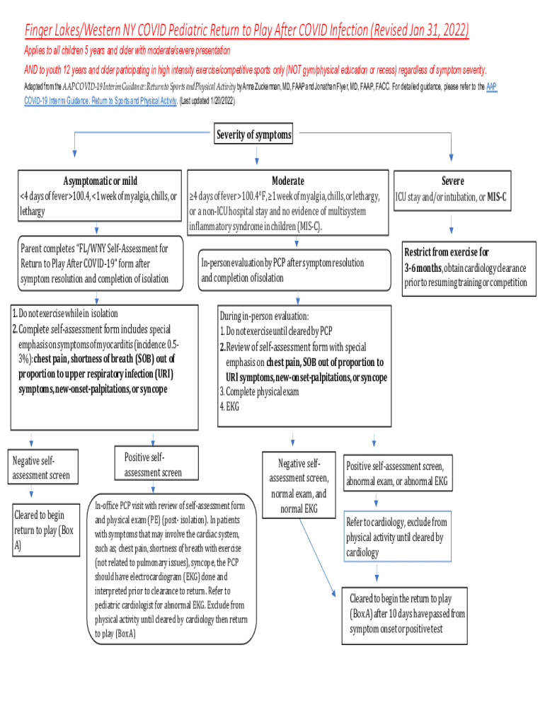 Finger Lakes/Western NY COVID-19 Pediatric Return to Play After COVID-19 Infection (Revised Jan 31, 2022) Applies to all children 5 years and older with moderate/severe presentation AND to youth 12