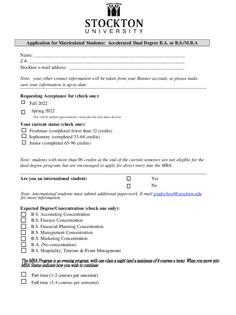Application for Matriculated Students: Accelerated Dual Degree B.A. or B.S./M.B.A Name: ___ Z #: ___ Stockton email address: ___ Note: your other contact information will be taken from your Banner