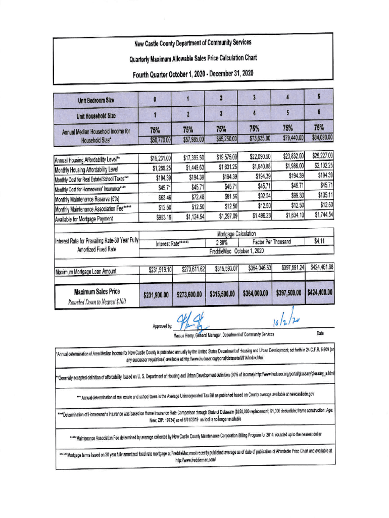 New Castle County Department of Community Services Quarterly Maximum Allowable Sales Price Calculation Chart Fourth Quarter October 1,2020, December 31, 2020, Unit Bedroom Size012345Unit Household
