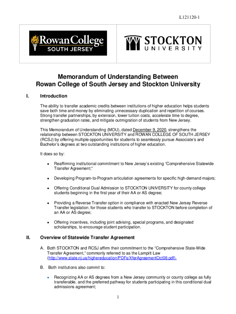 L1211201Memorandum of Understanding Between Rowan College of South Jersey and Stockton University I. Introduction The ability to transfer academic credits between institutions of higher education