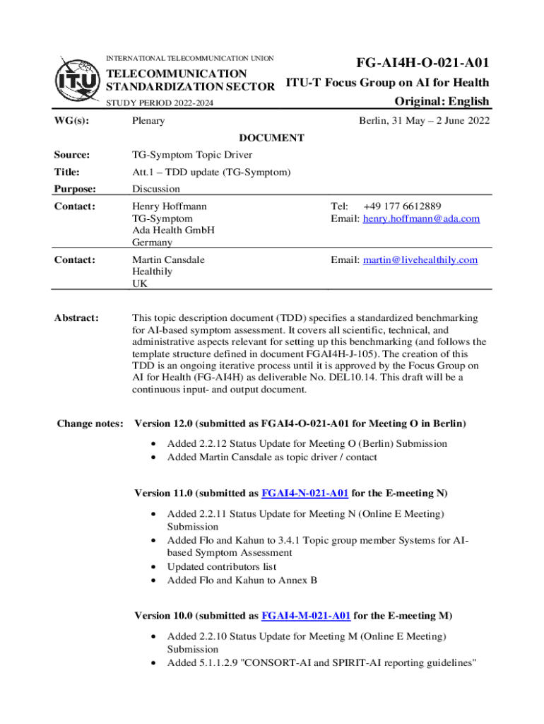 INTERNATIONAL TELECOMMUNICATION UNIONFGAI4HO021A01TELECOMMUNICATION STANDARDIZATION SECTOR ITU Focus Group on AI for HealthOriginal: EnglishSTUDY PERIOD 20222024WG(s):Berlin, 31 May 2 June 2022Plenary