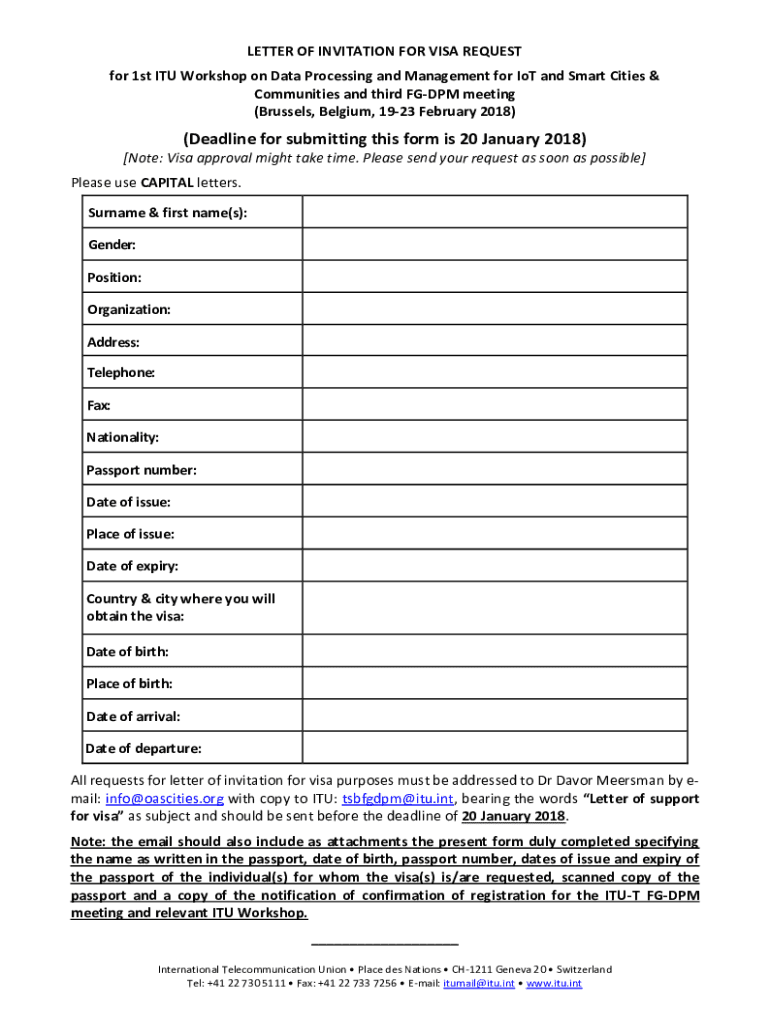 LETTER OF INVITATION FOR VISA REQUEST for 1st ITU Workshop on Data Processing and Management for IoT and Smart Cities & Communities and third GDP meeting (Brussels, Belgium, 1923 February 2018)(Deadline