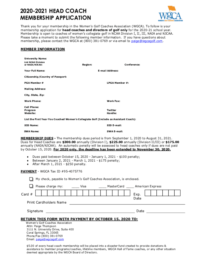 20202021 HEAD COACH MEMBERSHIP APPLICATION Thank you for your membership in the Women's Golf Coaches Association (GCA). To follow is your membership application for head coaches and directors of golf