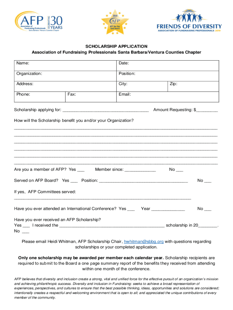 SCHOLARSHIP APPLICATION Association of Fundraising Professionals Santa Barbara/Ventura Counties Chapter Name:Date:Organization:Position:Address:City:Phone:Fax:Zip:Email:Scholarship applying for: ___Amount