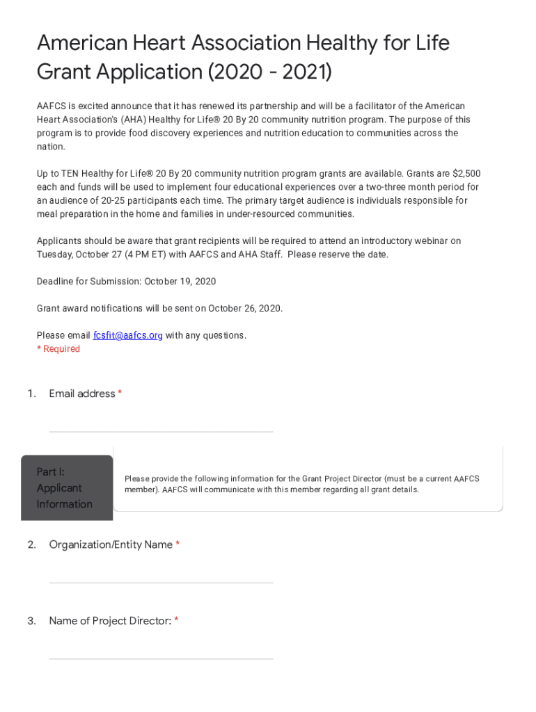 American He Association Healthy for Life Grant Application (2020 2021) AA FCS is excited announce that it has renewed its partnership and will be a facilitator of the American Heart Association\'s